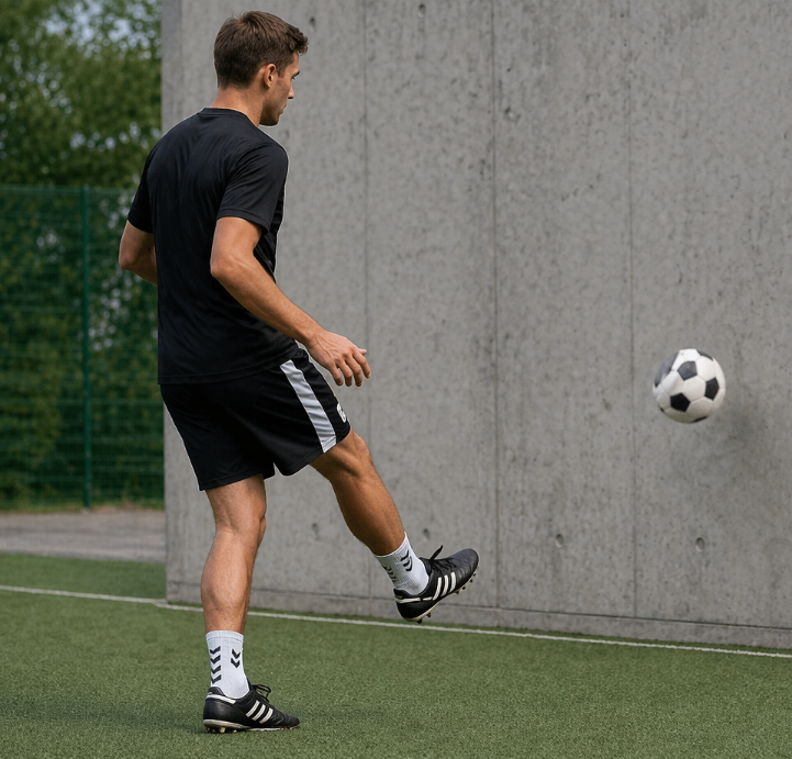 • Passa mot vägg med insidan av foten. Ta emot studs och passa direkt tillbaka.